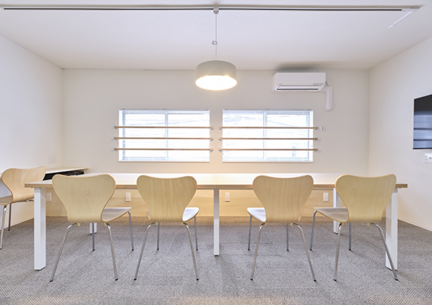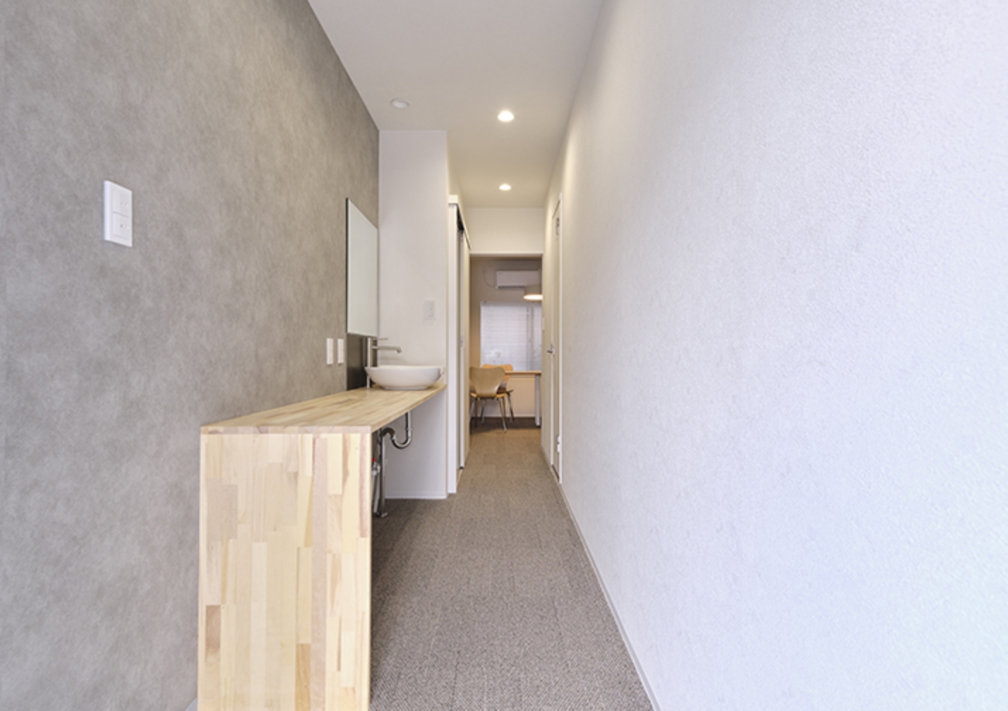 白を基調とした落ち着いた空間に、穏やかな光が差し込みます。 かつての住宅を改装した45.8㎡の1DKには、ダブルベッドを2台と大型テーブルを備えており、仕事や食事、語らいなど多目的にご利用いただけます。無料Wi-Fiと洗濯乾燥機を完備し、長期滞在にも快適です