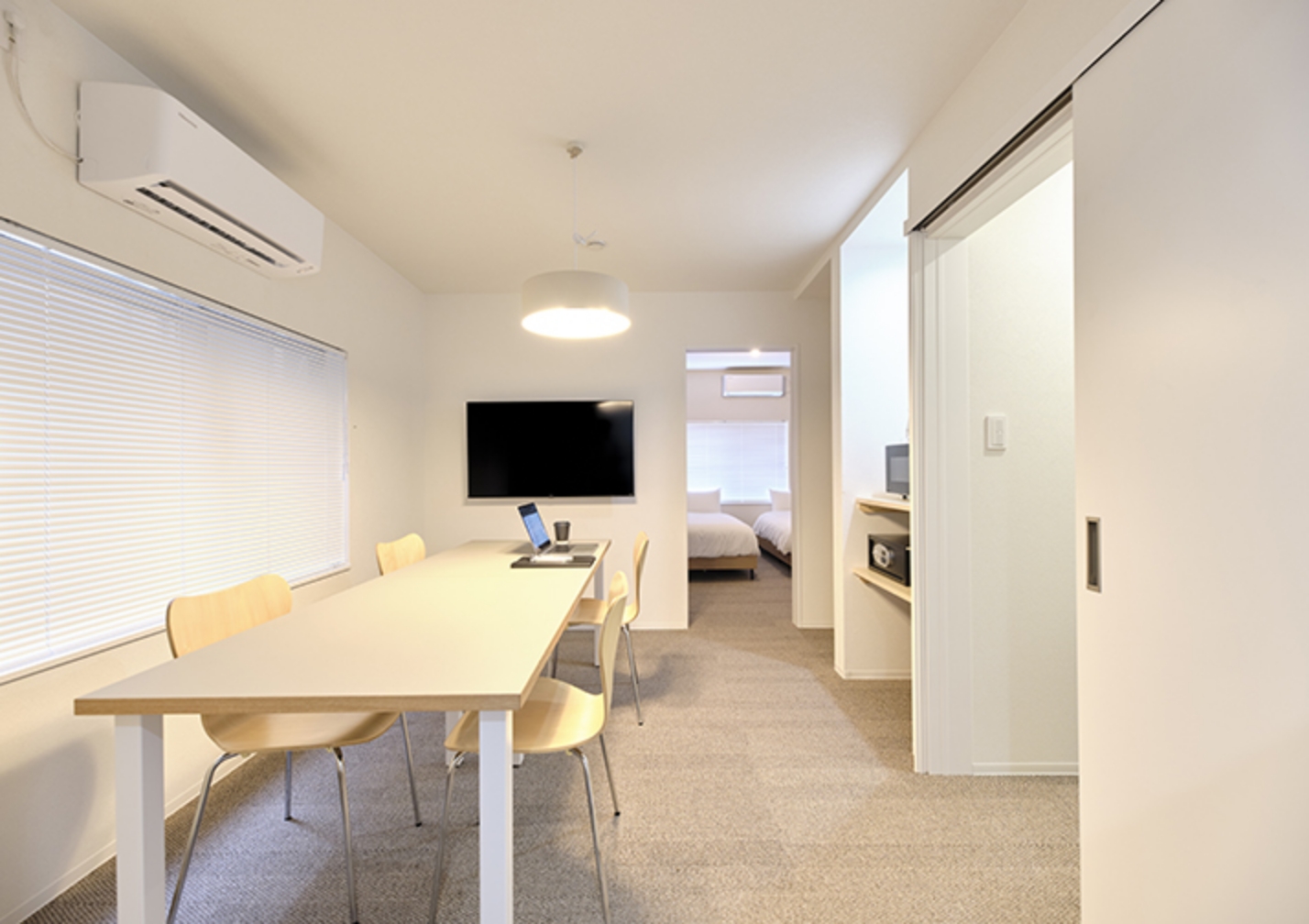白を基調とした落ち着いた空間に、穏やかな光が差し込みます。 かつての住宅を改装した45.8㎡の1DKには、ダブルベッドを2台と大型テーブルを備えており、仕事や食事、語らいなど多目的にご利用いただけます。無料Wi-Fiと洗濯乾燥機を完備し、長期滞在にも快適です